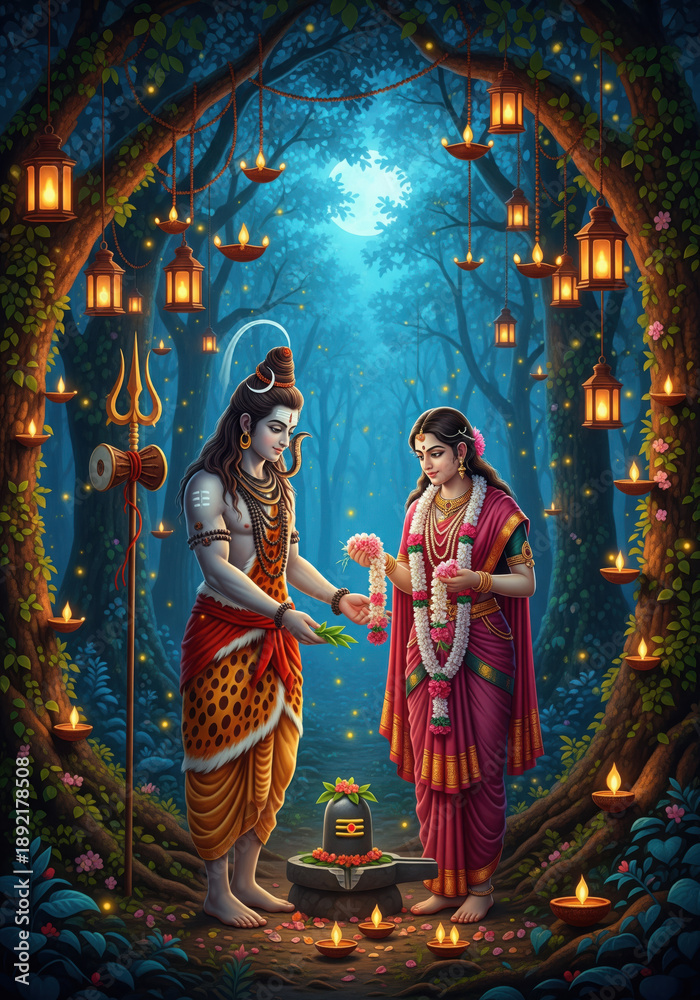 Lord Shiva and Goddess Parvati Exchanging a Garland in a Magical Forest Hindu deities #1892178508