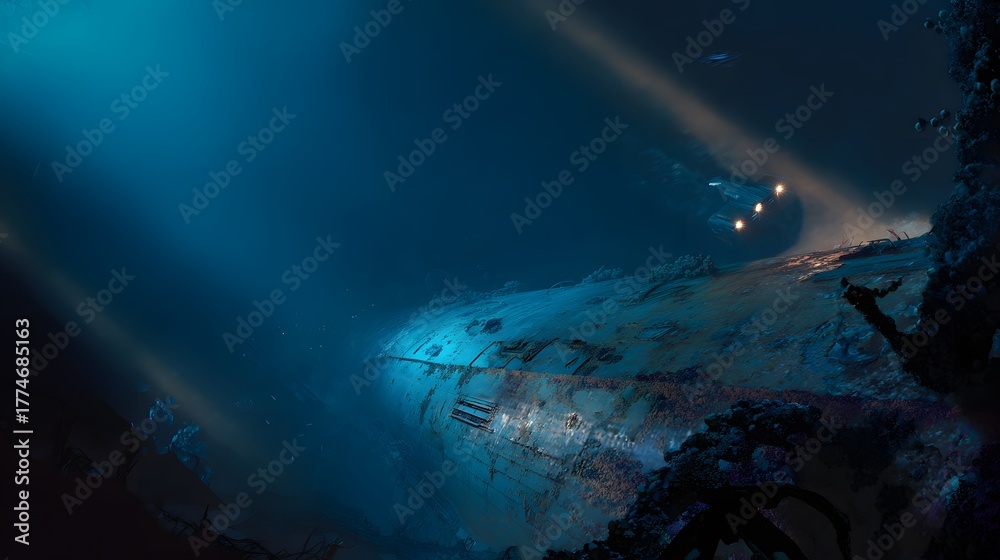 Lost submarine wreck deep ocean exploration eerie shadows reveal forgotten history underwater scene #1774685163