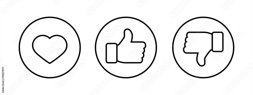 Love, like, and dislike icon on circle line. Heart, hand thumb up and down sign symbol, vector 10 eps. #1108278171