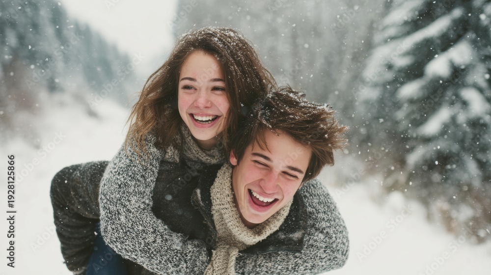 Lovely couple romantic moment. A man carrying a woman on his back in the snow, both wearing jackets and smiling. The background is blurred, with snowflakes falling, creating a wintery atmosphere. #1928125866