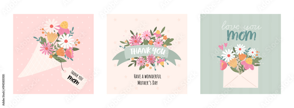 Lovely hand drawn Mother's Day designs, cute flowers and handwriting - great for cards, invitations, gifts, banners - vector designs #1945805100