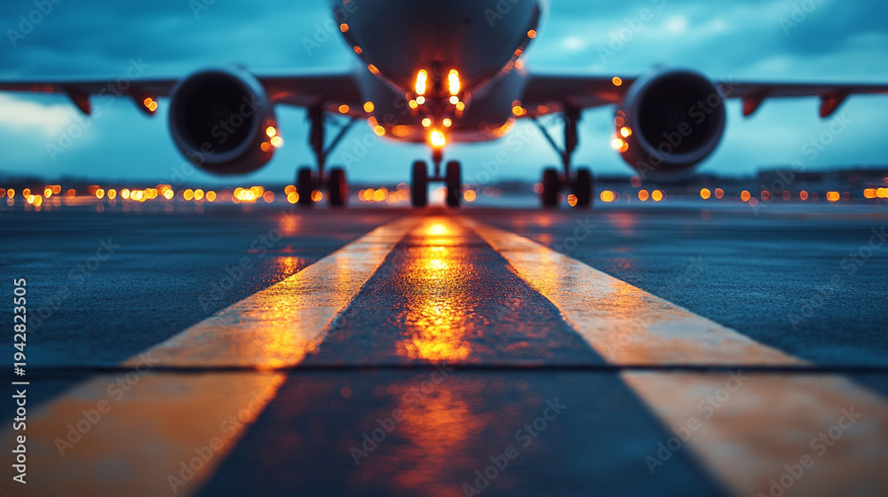Low angle close-up of runway tarmac markings and glowing taxiway edge light, airplane in background piloted by female captain during evening airport operations #1942823505