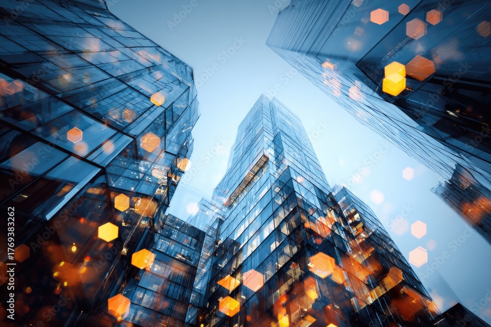 Low-angle shot of modern skyscrapers with a blue and gold bokeh effect #1769383262