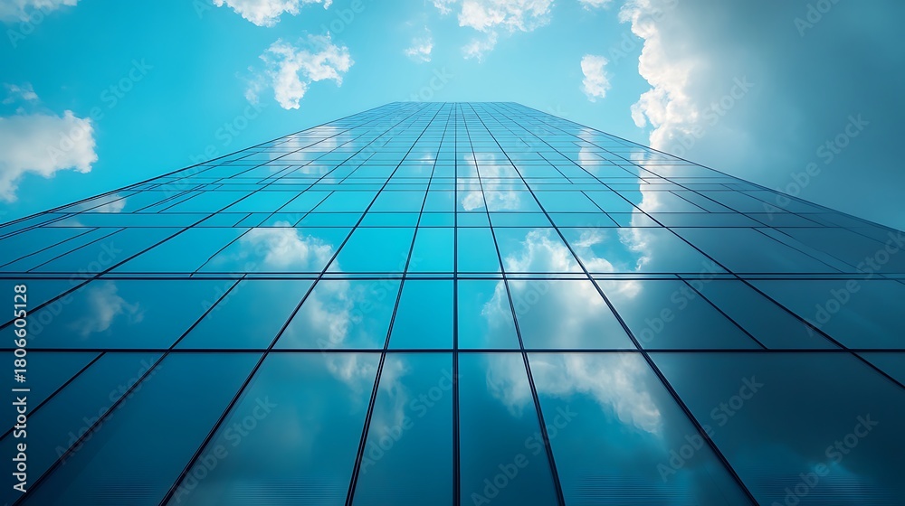 Low angle view of a glass skyscraper reflecting the clouds and blue sky on a bright sunny day #1806605128