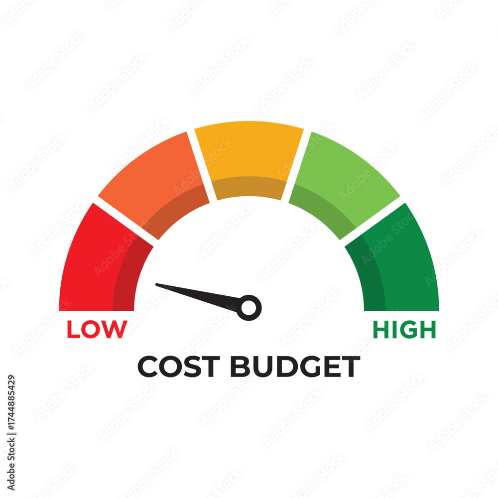 Low cost budget meter icon. Budget concept on speedometer. vector illustration #1744885429