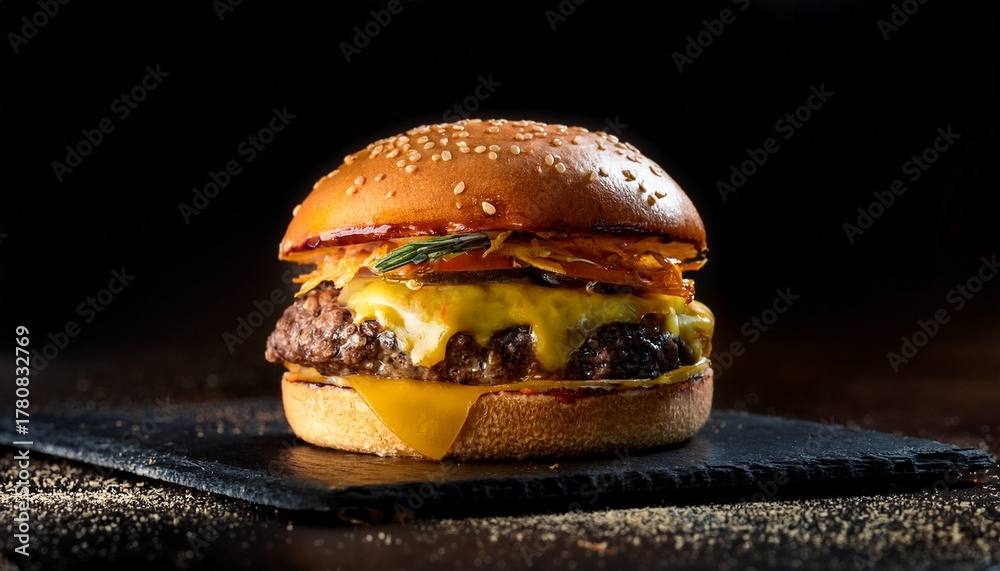 low key photograph of a gourmet burger on a dark slate plate light falling softly on the bunrs sesame seeds and glossy melted cheese background completely swallowed in black with #1780832769