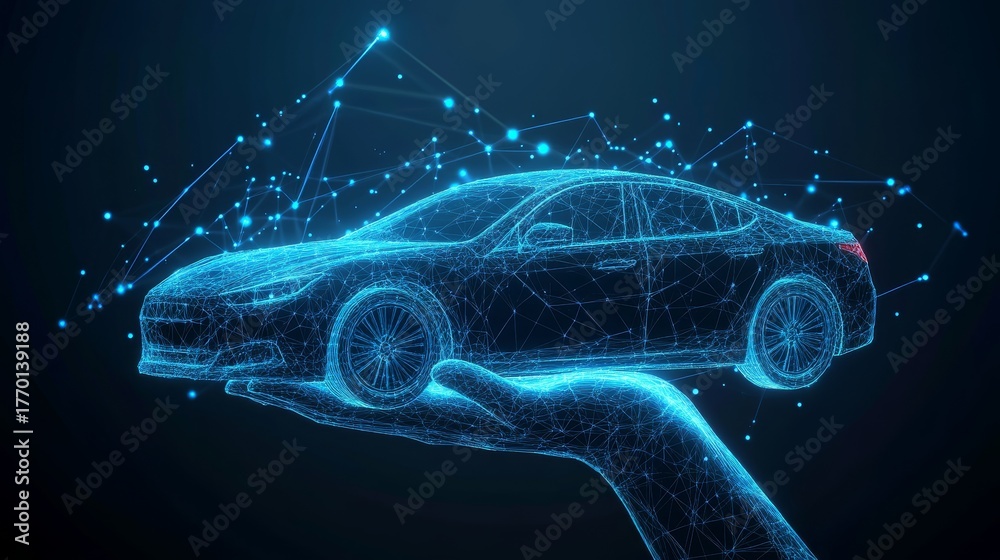 Low poly, 3D hand, cupped, holding a stylized car, dark blue backdrop, wireframe, glowing dots and lines, abstract shapes, constellation-like stars, sense of levitation, auto industry themes, rental, #1770139188