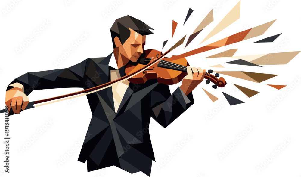 Low-poly vector illustration of a violinist executing a sweeping bow stroke, single musician with sharply faceted anatomy and #1913411038