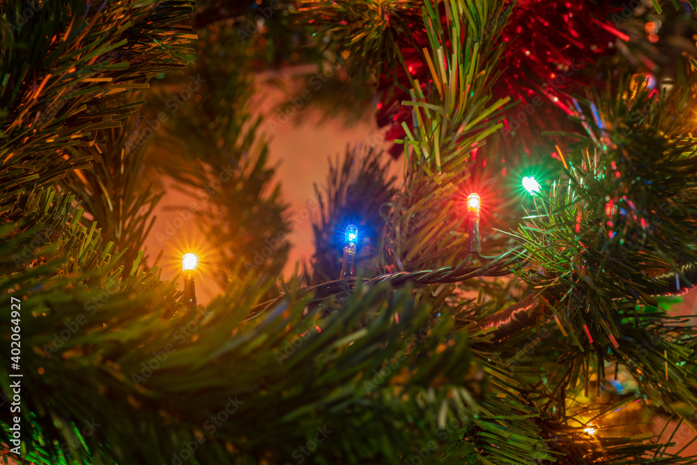 Luces decorativas de diferentes colores en un árbol de Navidad. #402064927
