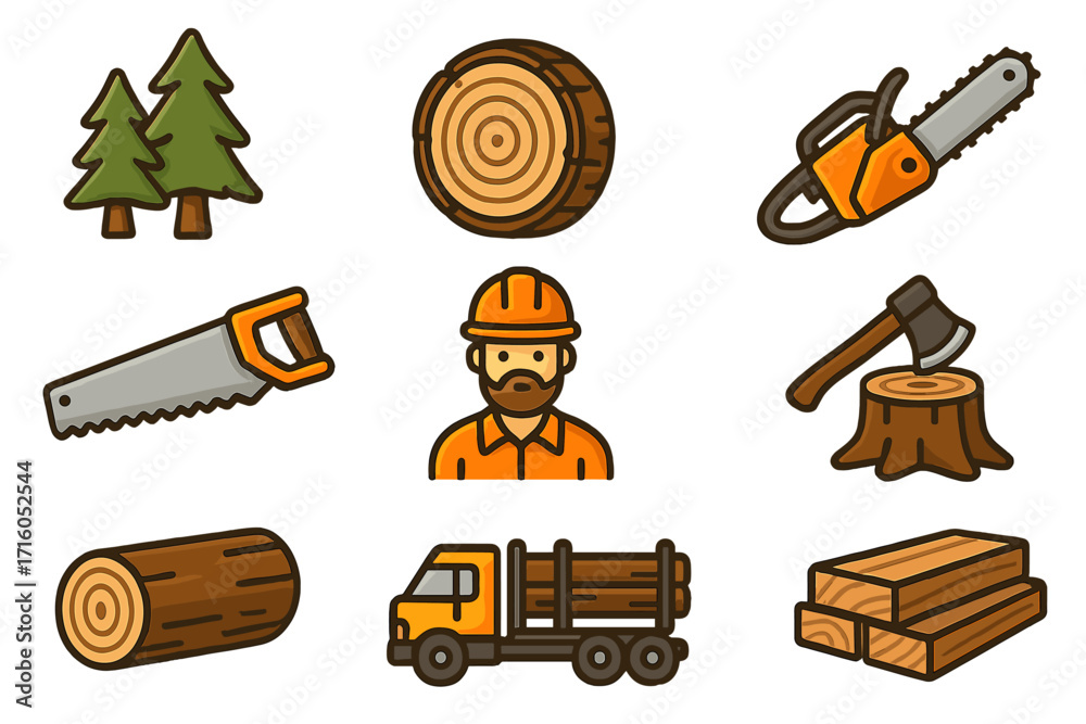 Lumberjack icon set. Forestry and logging industry vector icons. Wood, timber, logger, chainsaw, axe, tree, truck and saw. Woodcutting and woodworking concept elements. #1716052544