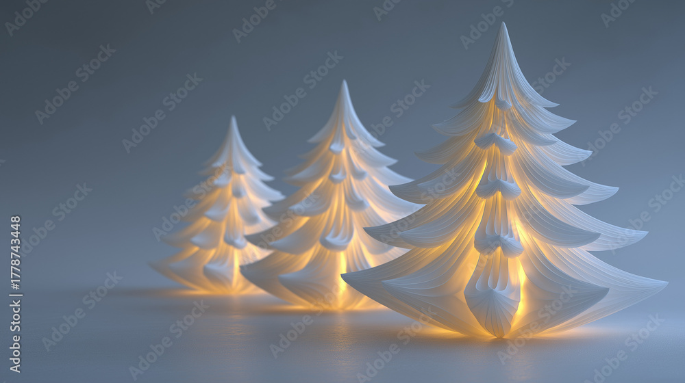Luminous Winter Forest: A serene winter scene unfolds with stylized, glowing tree figures casting a warm light against a gradient backdrop, embodying peace and elegance. #1778743448