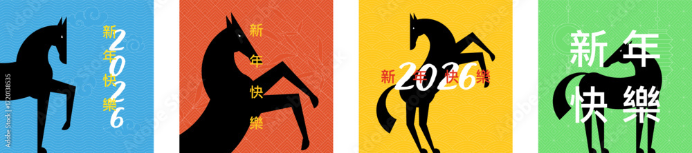 Lunar New Year 2026 horse zodiac greeting. Chinese colorful background set with lanterns and oriental patterns. Modern template for banner, poster or invitation. China text translation: Happy New Year #1720138535