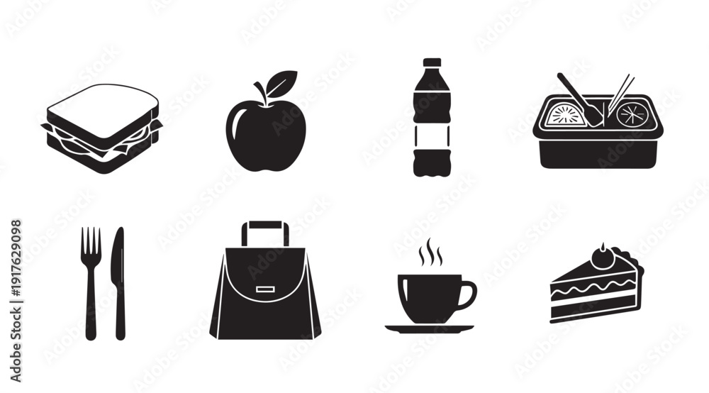 Lunch Icons Set: Sandwich, Water Bottle, Salad, Cutlery, Bag, Coffee, Cake #1917629098