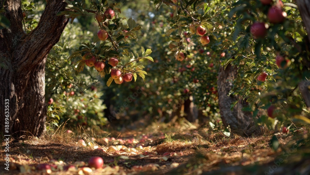 Lush apple orchard scene, ripe fruit hanging on branches, sunlight filters through foliage #1889633533