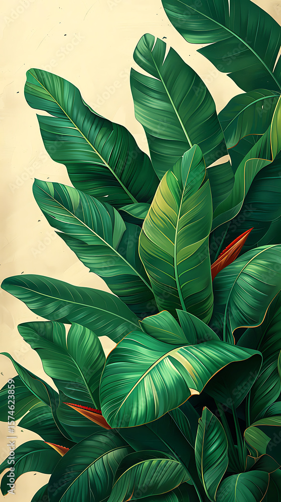 Lush banana leaves in vibrant sunlight create tropical foliage pattern #1574623859