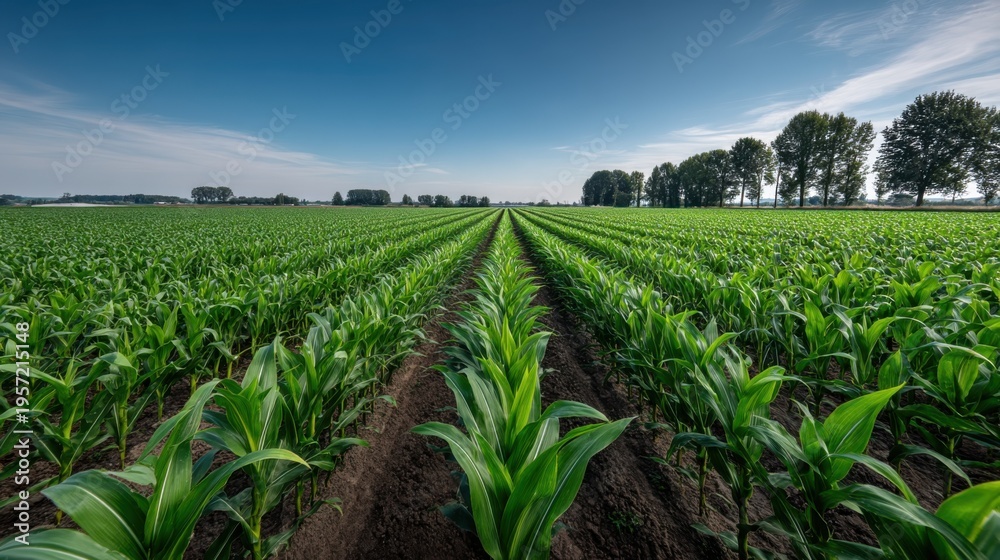 Lush Green Cornfield Under a Bright Blue Sky: Agriculture, Farming, and Sustainable Food Production #1957215148