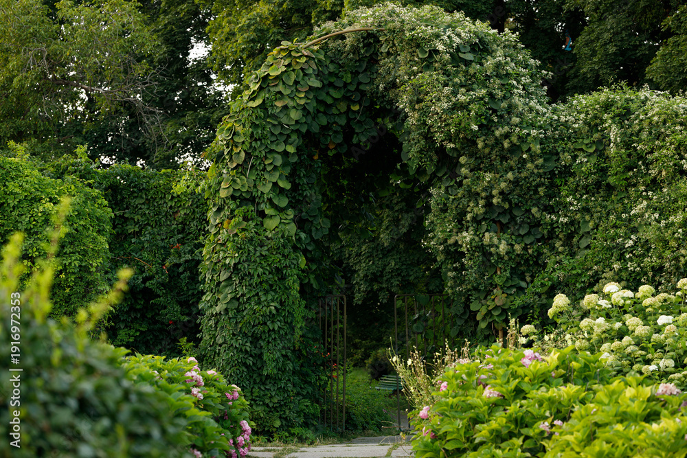 Lush green garden archway covered in dense foliage and blooming flowers, creating a secret entrance #1916972353