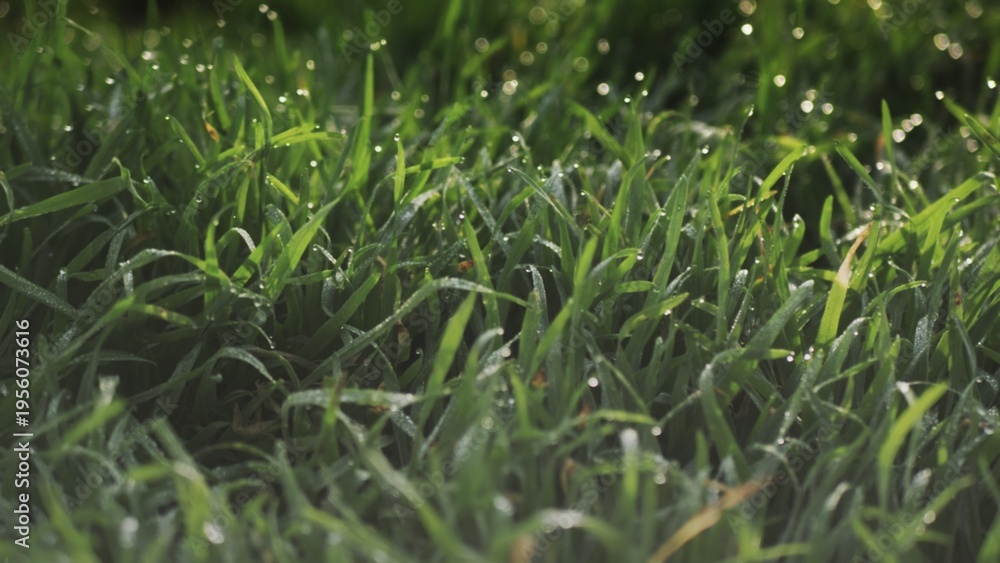 Lush green grass with dew drops. Spring forbs #1956073616