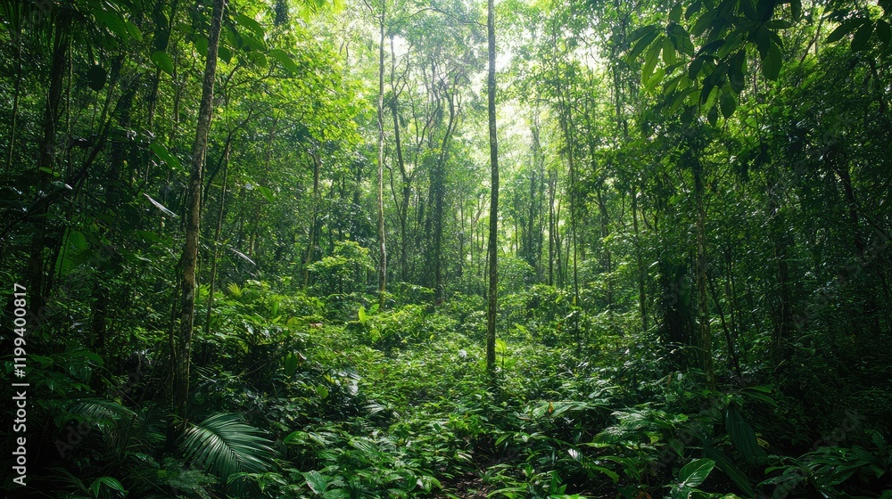 Lush green rainforest landscape with dense foliage and towering trees, vibrant shades of green, inviting empty space for text, natural light filtering through. #1199400817