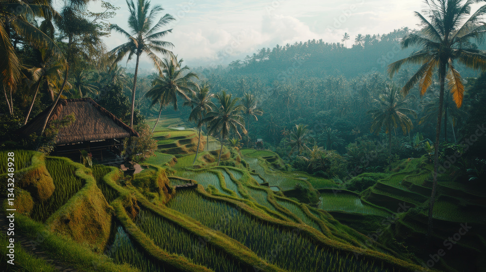 Lush green rice terraces in Bali, Indonesia with tropical palm trees and a small traditional hut in the background, reflecting sunlight in the water-filled fields, showcasing an iconic Southeast Asian #1343248928