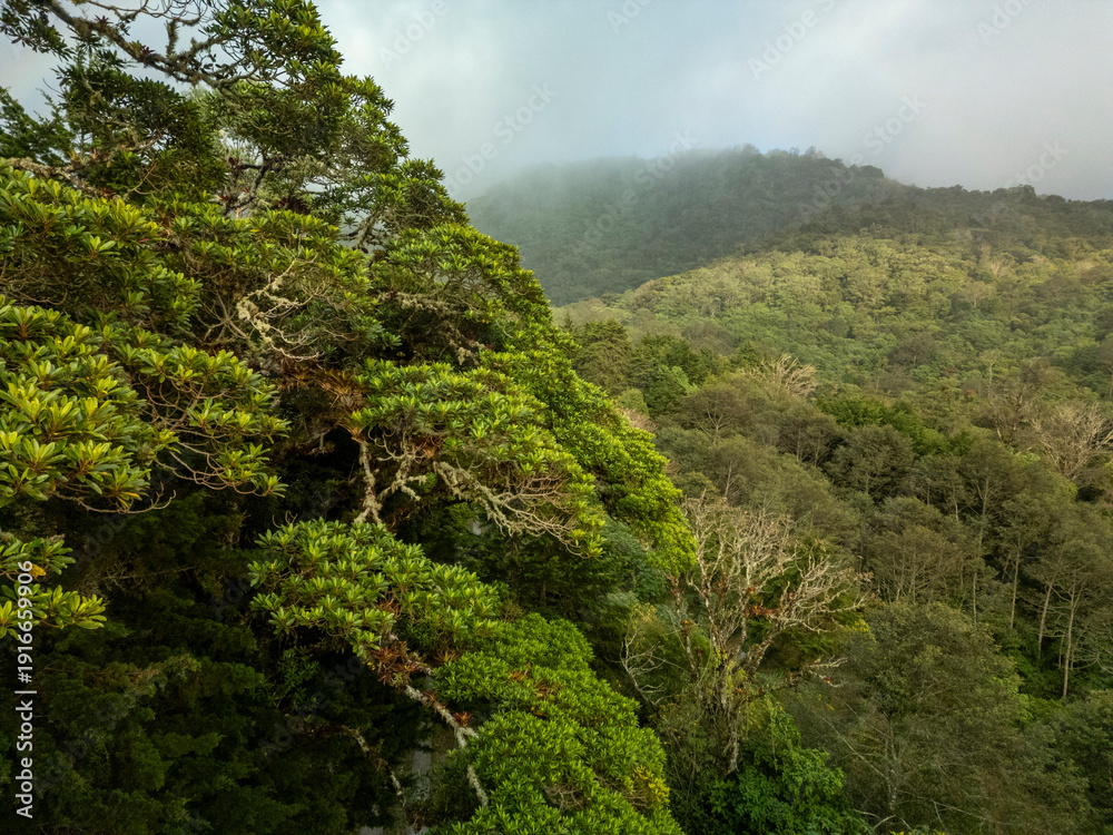 Lush tropical cloud forest landscape in the highlands of Boquete, inside Volcan Baru National Park. Mist drifting over dense mountain rainforest, Boquete, Chiriqui, Panama - stock photo #1916659906