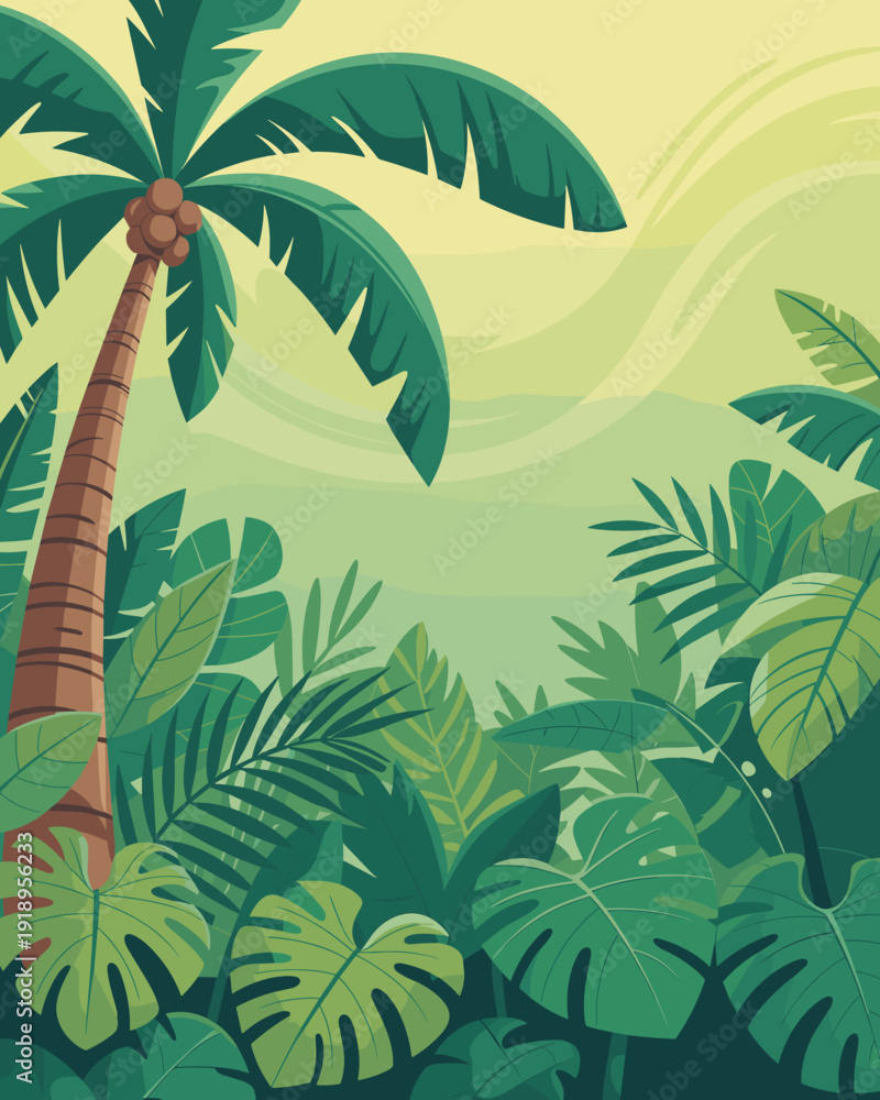 Lush Tropical Jungle Illustration: Immersive Scene of Exotic Flora Showcasing a Vibrant Palm Tree, Dense Greenery, and a Calming Backdrop in a Stylized Cartoon Style; Ideal for Ecotourism, Nature Illu #1918956233