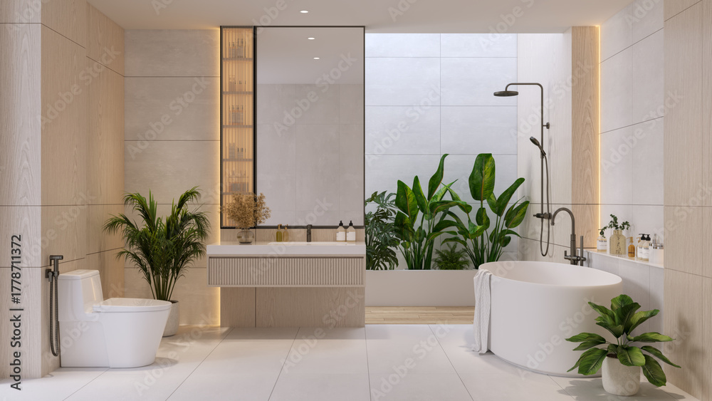 Luxurious bathroom interior decorated with indoor plants and a white freestanding bathtub. Spa-inspired modern space with a calm and natural feel.3drender #1778711372