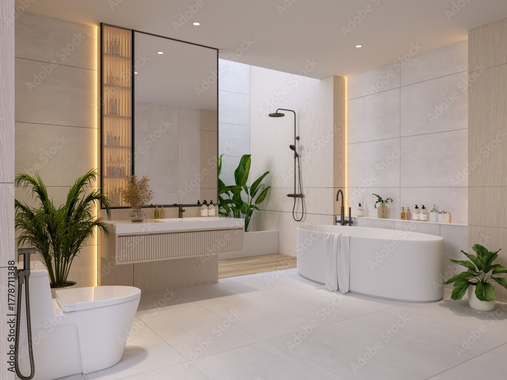 Luxurious bathroom interior decorated with indoor plants and a white freestanding bathtub. Spa-inspired modern space with a calm and natural feel.3drender #1778711388