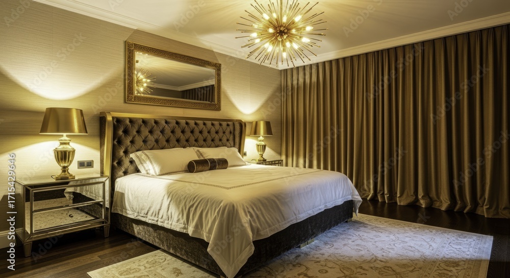 Luxurious Bedroom Interior with Tufted Headboard, Sputnik Chandelier, Gold Lamps, and Mirrored Nightstands, showcasing elegant design, warm lighting, and a sophisticated color palette. #1715429646