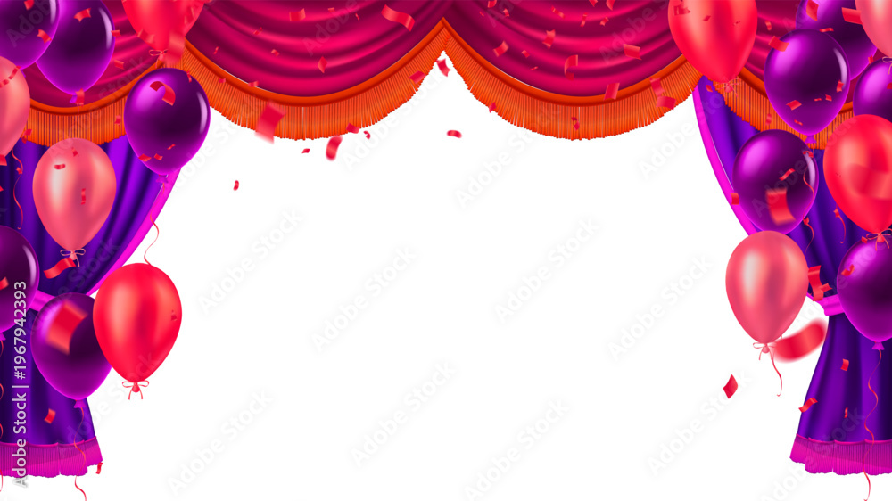 Luxurious celebration stage background featuring grand purple and magenta velvet curtains gold fringe trim at the top and sides The scene framed festive bunch glossy red and purple balloons #1967942393