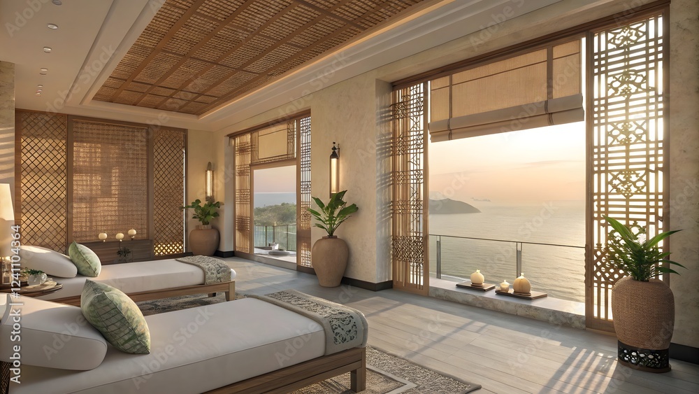 Luxurious Coastal Spa Room with Ocean View Asian Inspired Design Tranquil Setting #1241104364