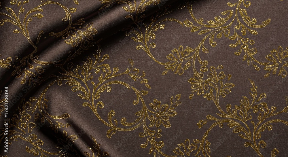 Luxurious dark brown fabric with intricate shimmering gold floral damask pattern, creating an elegant and opulent textile background for high-end design projects and sophisticated decor. #1742188094