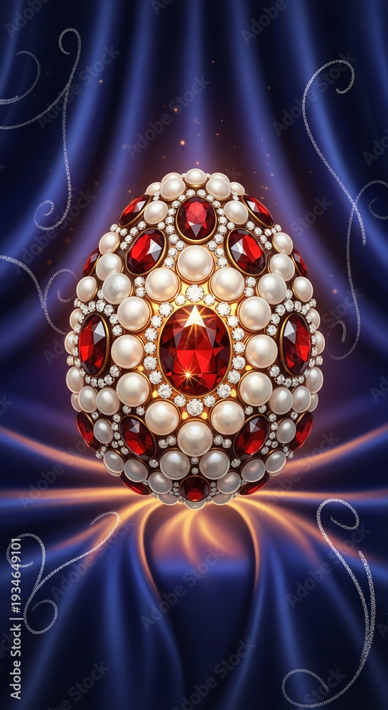 Luxurious Easter egg with precious stones on dark blue velvet, royal style, symbol of wealth and celebration, festive table decor, Easter, Christmas #1934649101