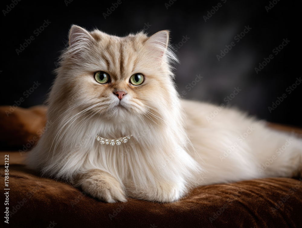 Luxurious fluffy Persian cat with calm gaze, featuring beautiful cream coat and elegant collar, exuding grace and tranquility #1788842122