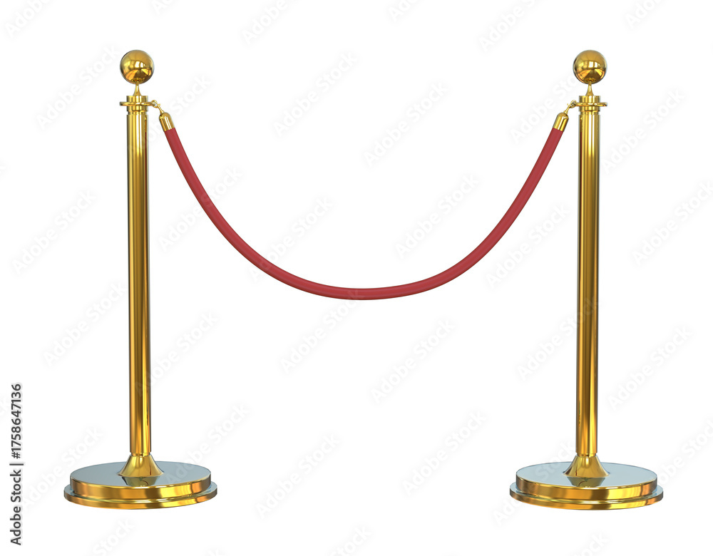 Luxurious Gold Stanchions or velvet rope stanchion. Golden stanchion and red velvet rope barrier for a VIP event isolated #1758647136