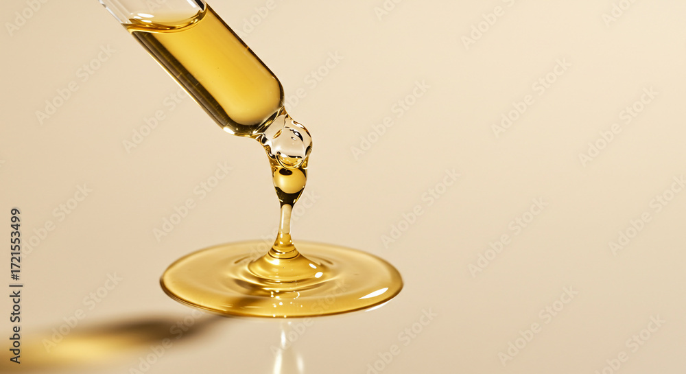 Luxurious golden serum dripping from pipette for skincare ads, showcasing natural beauty products and their hydrating benefits for radiant skin #1721553499