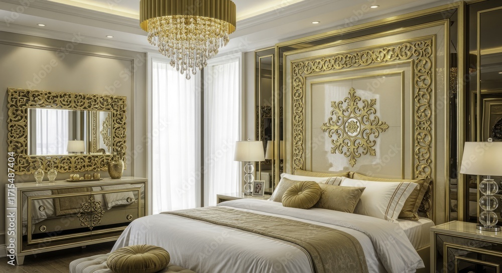 Luxurious Master Bedroom Interior with Ornate Gold Decor, Crystal Chandelier, Mirrored Furniture, and Elegant Plush Bedding in a Well-Lit, Spacious Setting #1715487404