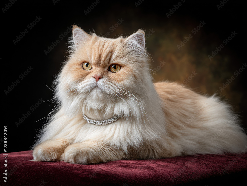 Luxurious Persian cat with calm gaze, featuring fluffy cream coat and elegant collar, exuding grace and tranquility #1788842091