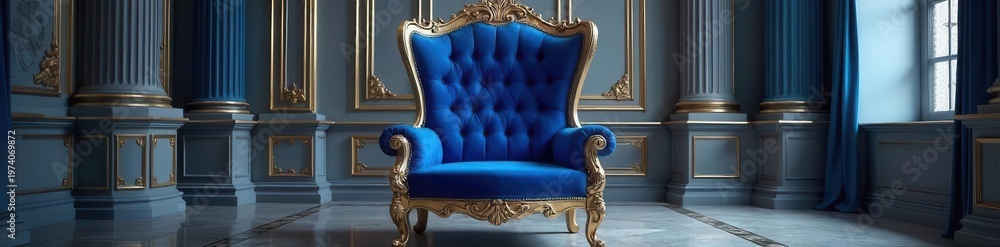 Luxurious royal blue velvet throne with tufted backrest in ornate silver hall setting, plush, luxury #1974069872