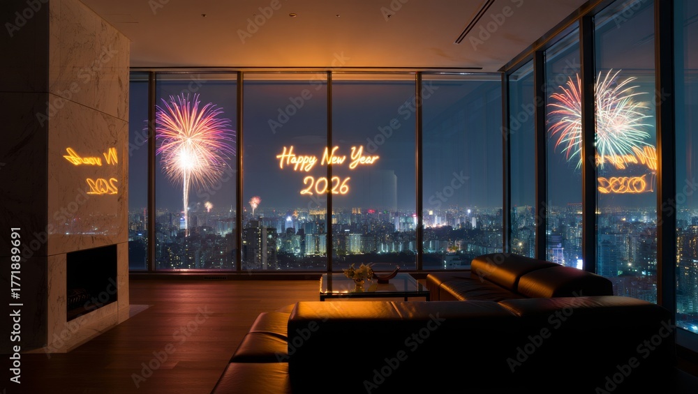 Luxury apartment New Year's Eve celebration with fireworks over city skyline, modern interior, 2026, festive atmosphere #1771889691