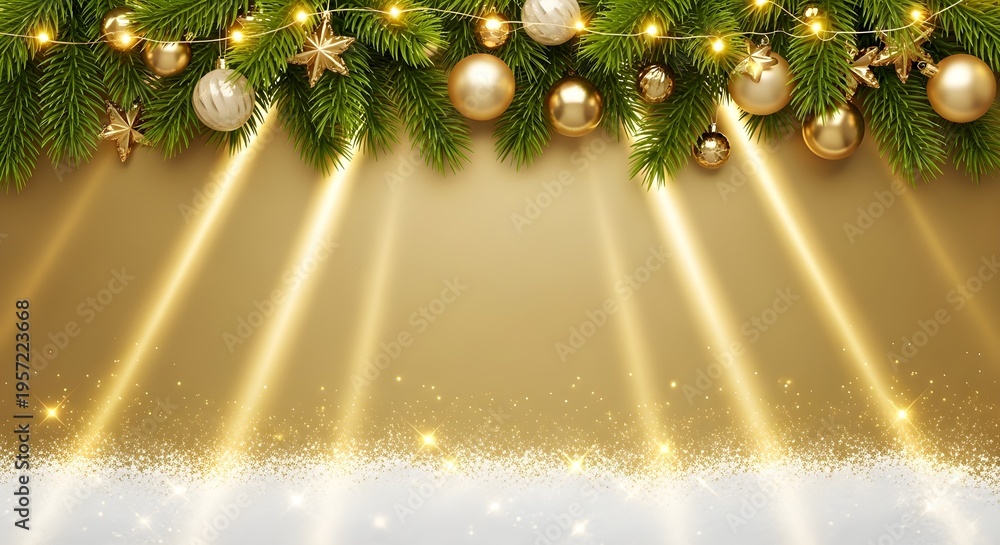 Luxury Christmas golden background with pine branches, ornaments and glowing light rays, festive holiday backdrop with copy space for banner, greeting card, promotion, winter celebration design #1957223668