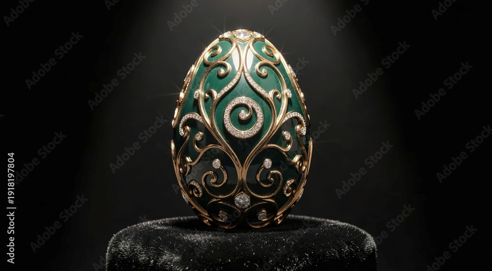 Luxury green jeweled faberge-style egg ornament with gold filigree and diamonds for easter decorative display, design, card, poster, background #1918197804