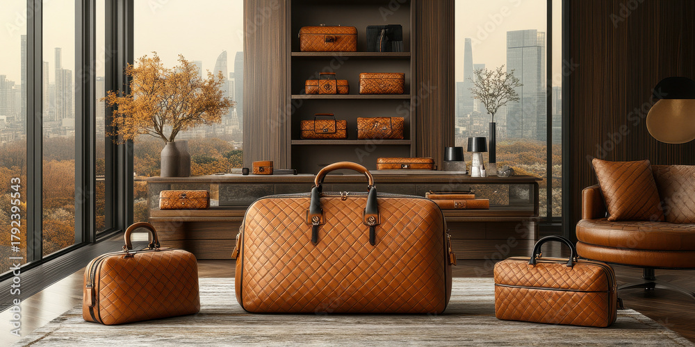 Luxury Leather Travel Bags Displayed in High-End Interior with Cityscape View Exclusive Fashion Accessories Brand Quality #1792395543