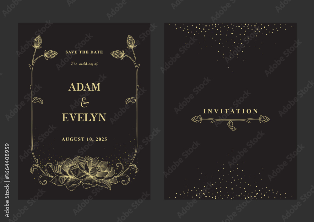 Luxury wedding invitation with lotus flowers golden line art on black background #1664408959