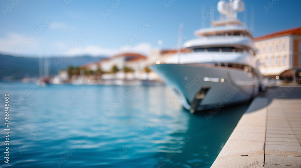 Luxury yacht docked in coastal town defocused Mediterranean, faceless maritime scene, cruise visualization detail, blurred harbor background, travel concept, luxury interface, yach #1785948060