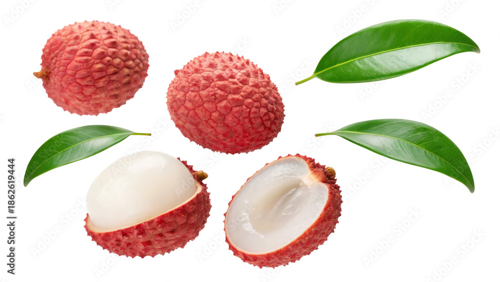 Lychee fruits and leaves isolated on white background showcasing texture and freshness #1862619444