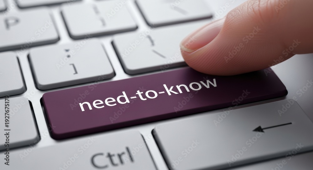 Macro Close-up of a Finger Pressing a Deep Purple "need-to-know" Keyboard Key on a Light Grey Modern Keyboard for Data Access Security #1927675170