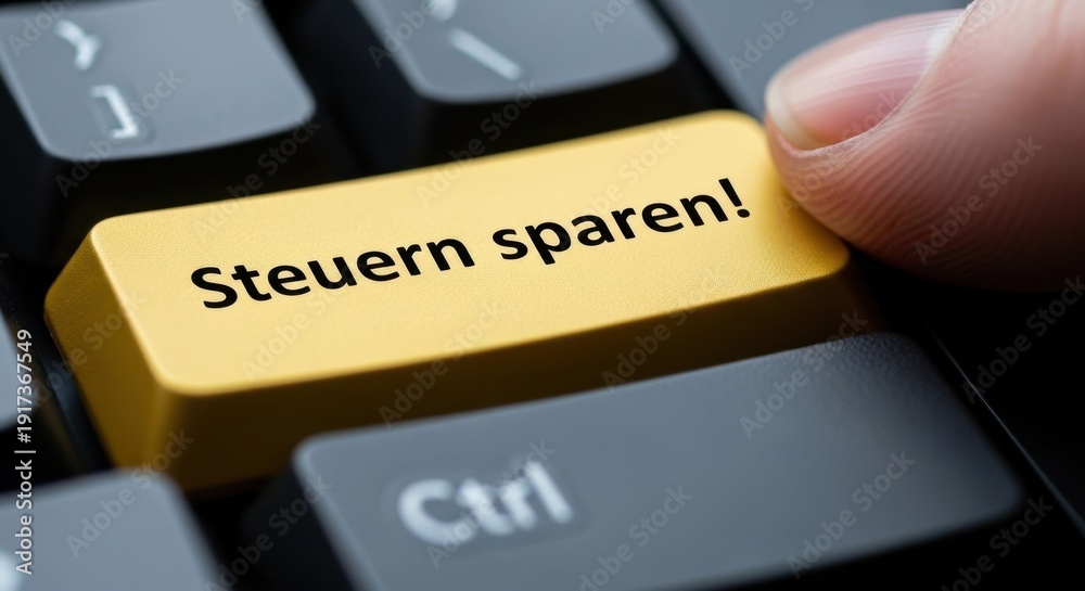 Macro Close-up of a Finger Pressing a Yellow "Steuern sparen!" Keyboard Key on a Dark Modern Keyboard for German Tax Incentives and Financial Savings #1917367549