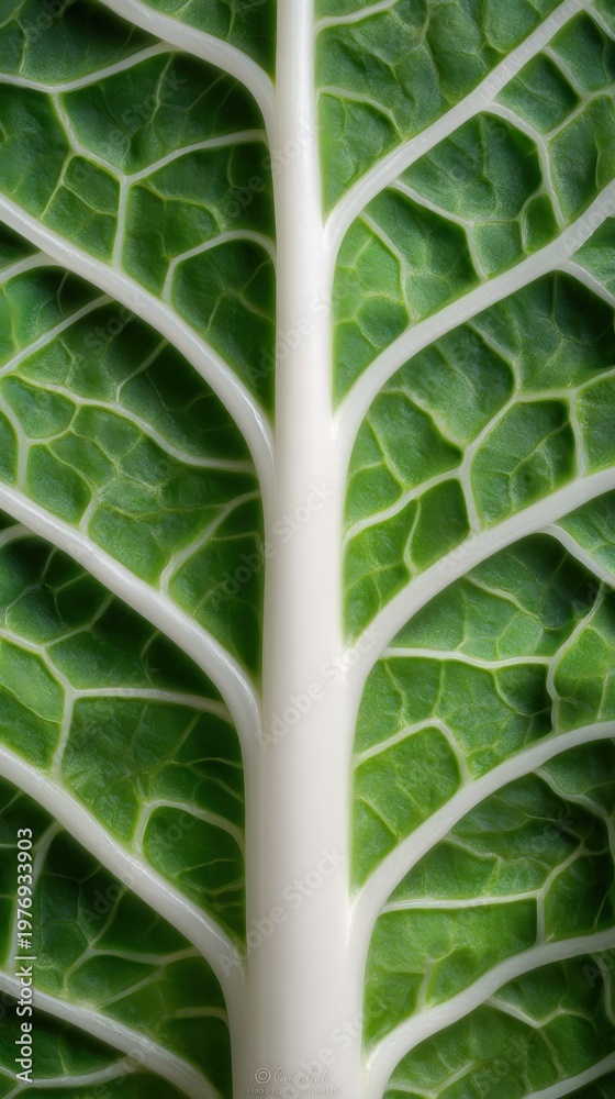 Macro green leaf texture with detailed veins natural organic pattern botanical background fresh plant structure close up eco nature concept high resolution symmetrical composition #1976933903
