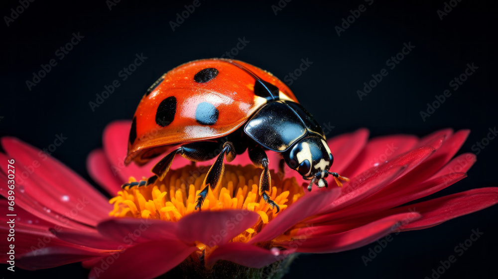 Macro photo of a ladybug sitting on flowers. Extreme macro close-up of an insect. Very detailed. Wold nature. #689630276